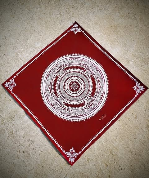 Traditionally, the base used was clay or mud mixed with cow dung (yes, earthy and sacred). The paint? A rice paste made by grinding atop chal (refined rice). Women would use their fingers to draw intricate patterns with this slurry, no brushes, no stencils, just maybe a piece of cotton cloth.